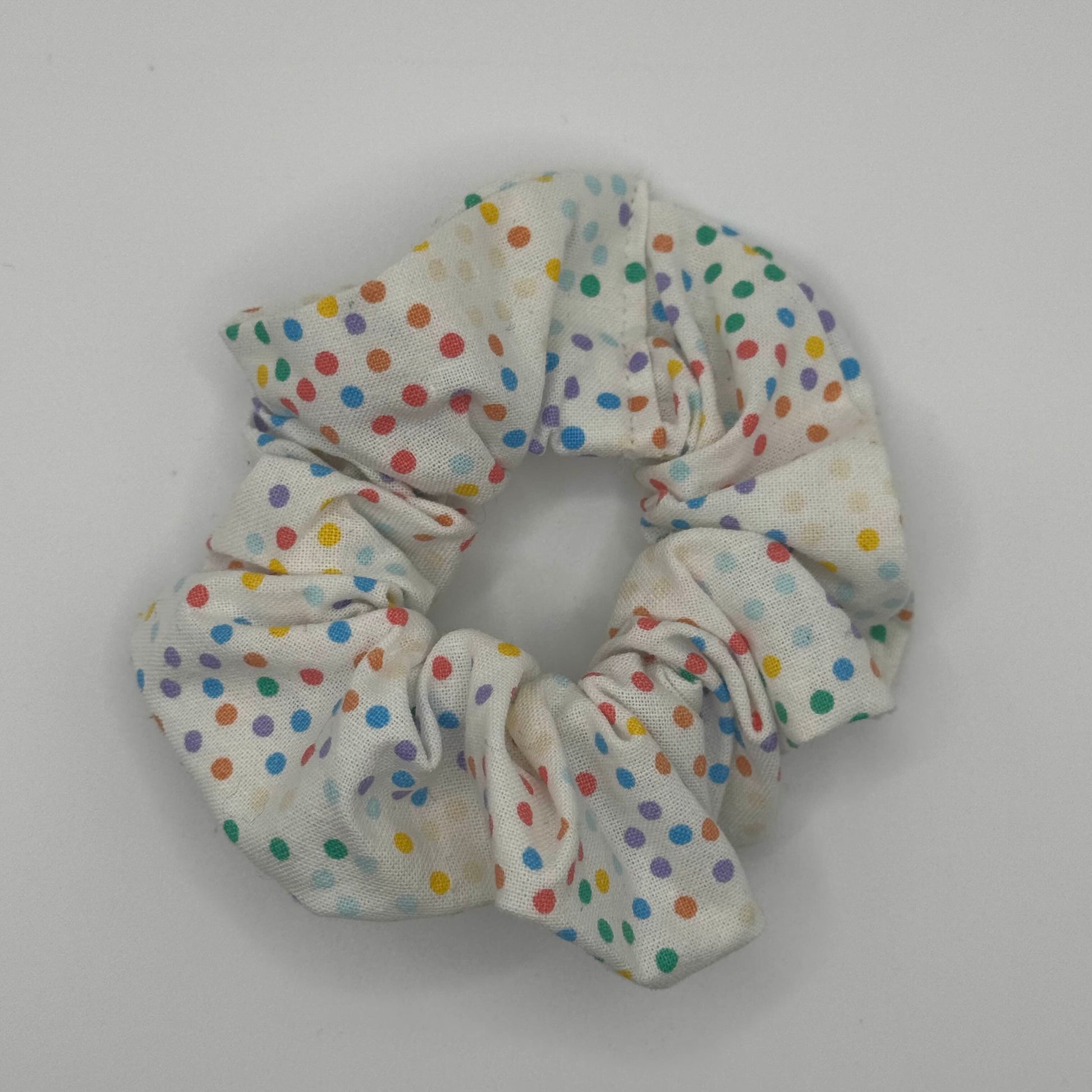 Claire is fun a wild party, so of course its confetti time! This scrunchie is perfect for celebrating and adding a little pop of rainbow to your day, hopefully bringing a smile with it. This cotton scrunchie is perfect addition to your every day rotation.